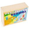 Confeccionado em M.D.F. 66 peças medindo 8 x 8 cm, serigrafadas em policromia ultravioleta atóxica, formando 10 jogos. Cachorro em sua casa, Estações do ano, Onde moram?, Posições corporais, A fazenda, Associação de ideia, Expressões faciais, As flores, Balões, Posições-lápis. Embalagem: Caixa de madeira com tampa serigrafada medindo 28 x 20 x 9 cm. Lacrada com película de P.V.C. encolhível.