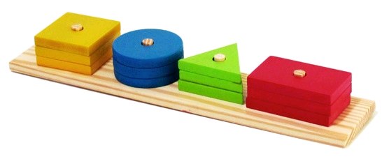 Material de encaixe para reconhecimento e associação de formas geométricas (quadrado, retângulo, triângulo e círculo), além de estimular a coordenação motora fina.
