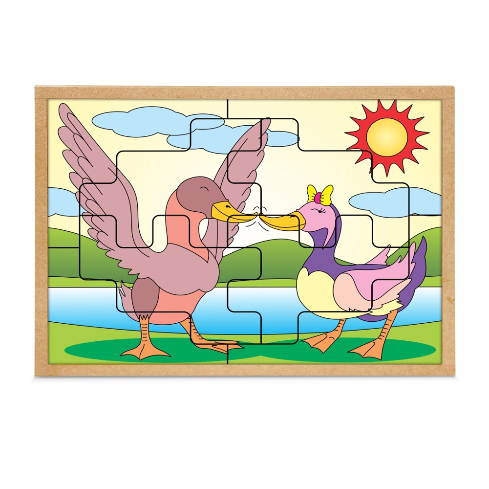 Confeccionado em M.D.F. composto por 8 peças pintadas e serigrafadas em policromia ultravioleta atóxica. Ilustração: Casal de patos. Medidas do quebra-cabeça montado: 30 x 23 cm. Acompanha 1 Base de M.D.F. em baixo relevo (para montar o quebra-cabeça), medindo 33,5 x 26,5 cm. Embalagem: Película de P.V.C. encolhível.