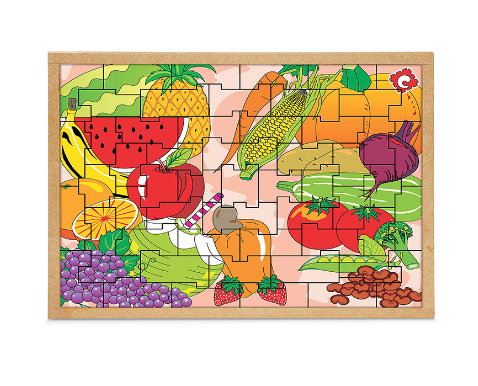Confeccionado em M.D.F. composto por 55 peças, pintadas e serigrafadas em policromia ultravioleta atóxica. Ilustração: Frutas e legumes. Medidas do quebra-cabeça montado: 30 x 23 cm. 1 Base de M.D.F. com um fundo em baixo relevo (para montar o quebra-cabeça), medindo 33,5 x 26,5 cm. Embalagem: Película de P.V.C. encolhível.