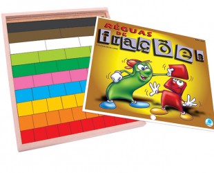 Este material deve ser usado na exploração das primeiras noções de frações. Ele permite a associação da representação fracionária às partes encontradas a partir da divisão em porções iguais. Além disso, o uso das réguas facilita a compreensão e a identificação de frações equivalentes: ½, 2/4, 3/6, – pela comparação em representações concretas. Material: MDF – nº de peças: 55 – 240x29x3 mm (peça maior) Embalagem: madeira – 317x267x26 mm Faixa etária: a partir de 06 anos