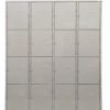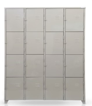 Armário roupeiro,  reforço vertical interno, travamento por dispositivo tipo fecho para cadeado externo, 3 aberturas tipo veneziana para circulação de ar e 4 pés em chapa # 18 dobrada, destacando o conjunto do piso. Normalmente usado em locais onde o usuário não tem necessidade em trocar de roupas, somente a guarda de objetos pessoais.