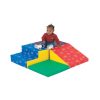 Circuito composto de escada puff, rampa e tapete, estimula o desenvolvimento das atividades psicomotoras da criança, auxilia no desenvolvimento das percepções visuais, por ser fabricado com cores fortes
