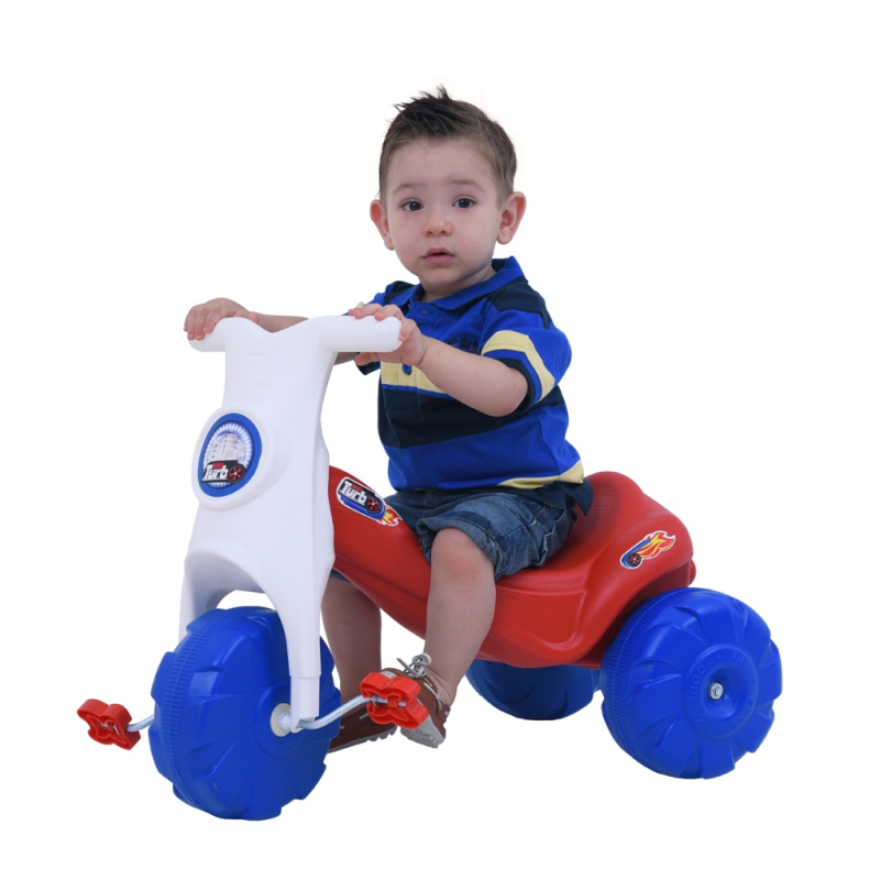 O triciclo New Turbo possui um estilo diferenciado mesclando traços retros e modernos. Possui assento anatômico e rodas robustas com design diferenciado. É um produto de fácil e rápida montagem.